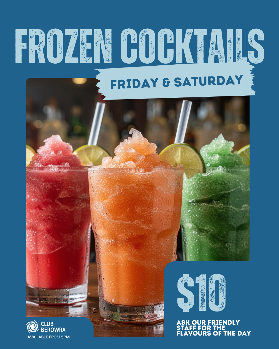Kick off the weekend the right way with our $10 Frozen Cocktails, available Friday and Saturday nights from 5pm.