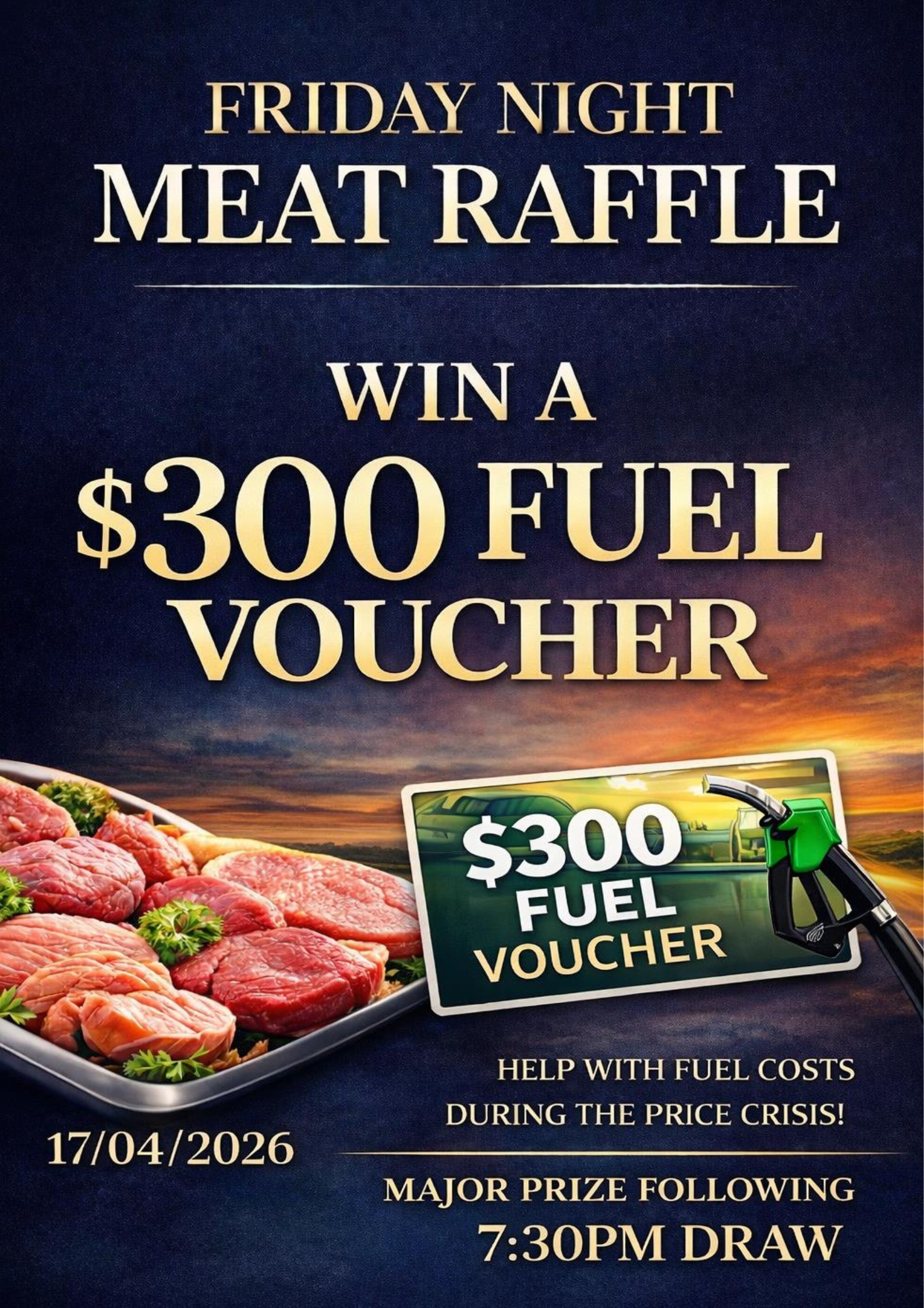 Join us for a special Friday Night Meat Raffle on 17/04/2026, featuring a major prize, your chance to win a $300 fuel voucher.